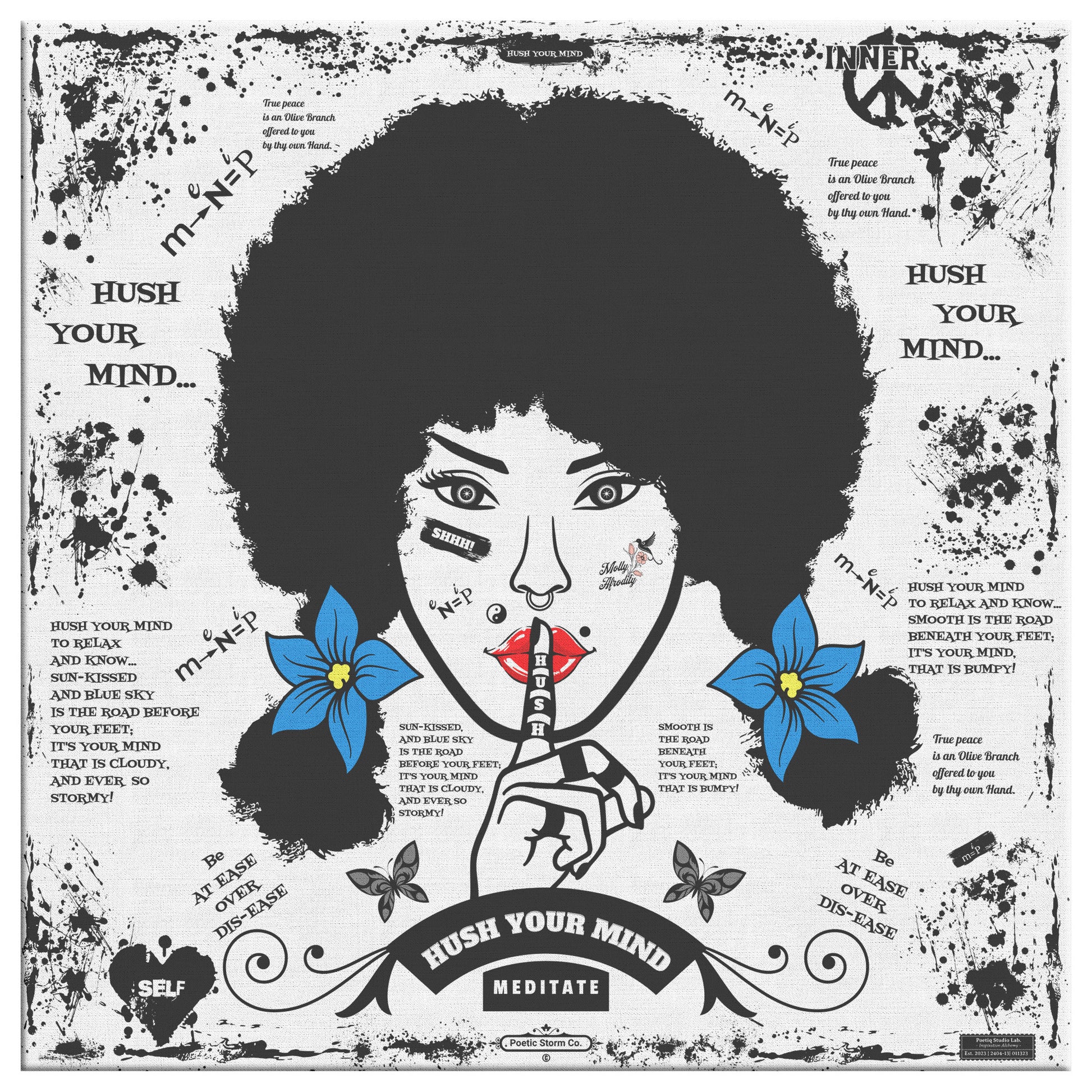 introducing "Molly Afrodity" our Meditation Queen & Cheerleader, born to hang upon your wall as a daily reminder to "Hush your Mind" by meditating at least once per day to ground yourself and keep you from falling victim to the chatty "Prophet of Doom" (Ego) that keeps us in a state of Dis-ease with false disasters that DO NOT exist and that will never come.